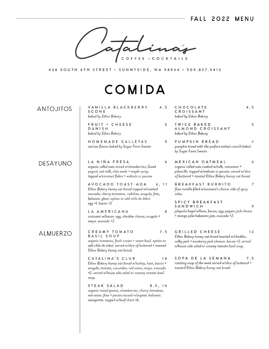 Introducing the vibrant menu at Catalina's Coffee + Cocktails, located in Sunnyside, WA, where mornings meet culinary artistry. This cafe masterfully blends exceptional coffee with a diverse selection of delectable dishes. Start your day with their acclaimed Chocolate Croissant or a delightful Twice Baked Almond Croissant, each bursting with flavor and flaky perfection. For a heartier option, the Avocado Toast and Breakfast Burrito shine brightly, though be mindful of the bold balsamic glaze accompanying the toast.